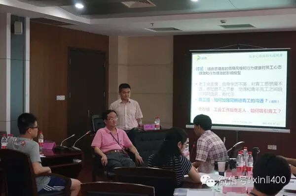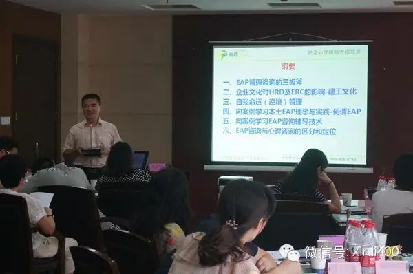 在上海某建筑集团二楼会议室,上海益西EAP落地专家朱老师和30多位中高层管理者通过案例讨论的形式探讨如何解决企业管理困惑问题。结合集团企业文化“和谐为本、追求卓越、回报社会、惠及员工”朱老师互动分享了EAP管理咨询的三板斧:
