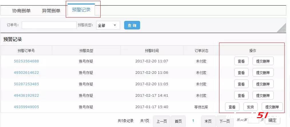 2.一旦商家出库或提交删单,预警页面的预警订单和订单管理页面的预警标识都会消失。
