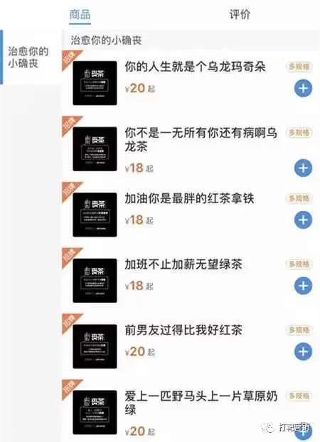 最近大火的丧茶也深谙“自黑之道”。和传统价值观大相径庭,丧茶为自己取了各种飘荡着诡异绝望气息的名字。“你的人生就是个乌龙玛奇朵”、“你不是一无所有你还有病啊乌龙茶”、“加油你是最胖的红茶拿铁”、“加班不止加薪无望绿茶”……