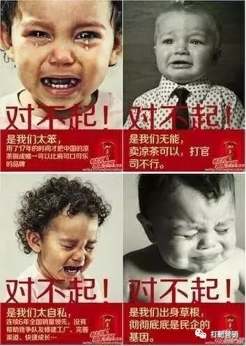 你还记得加多宝和王老吉之间的那场旷日持久的品牌名称之战吗?最终以加多宝的败诉落下帷幕。但是,在“红罐凉茶改名加多宝”这句广告语被裁定禁止后,加多宝随即推出了系列声泪俱下的道歉海报。比如,“对不起!是我们太笨,用了17年的时间才把中国的凉茶做成唯一可以比肩可口可乐的品牌”。